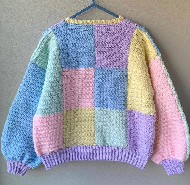A hand crocheted sweater with a punchy, colorful pattern.